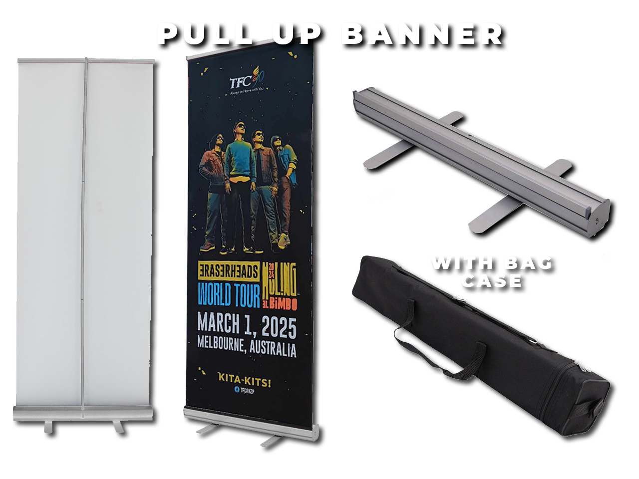 Includes: Banner stand, custom-printed graphic, carry case